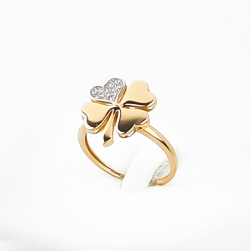 انگشتر طلا طرح شبدر نگیندار، روی پایه حلقهای شکل سوار شدهاست. نکته مهم، استفاده از فرم حلقه دوبل باز است که هم به استحکام کار کمک کرده و هم باعث زیبایی و جلوه بیشتر انگشتر در دست میشود.